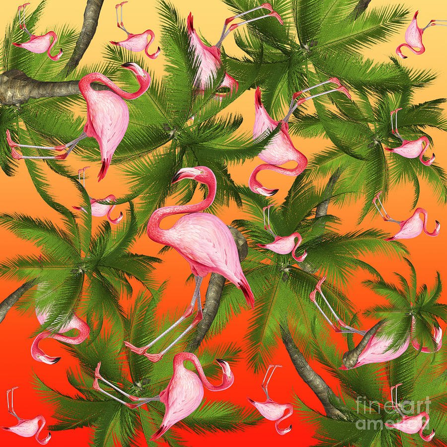 Flamingo tropical summer mood on green palms trees and summer fill.